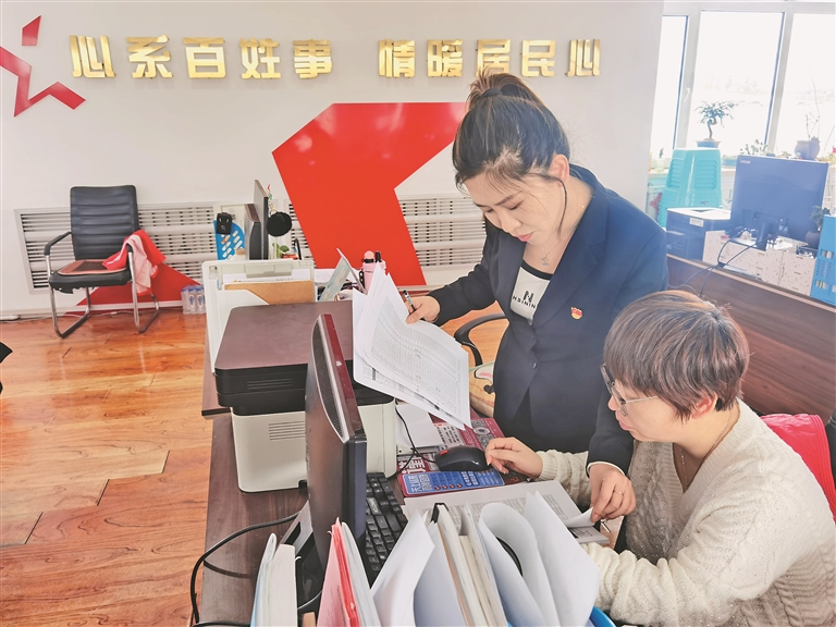 育英社區(qū)黨委書記、匯興物業(yè)董事長何宇(左)與社區(qū)工作人員查看居民反饋信息。