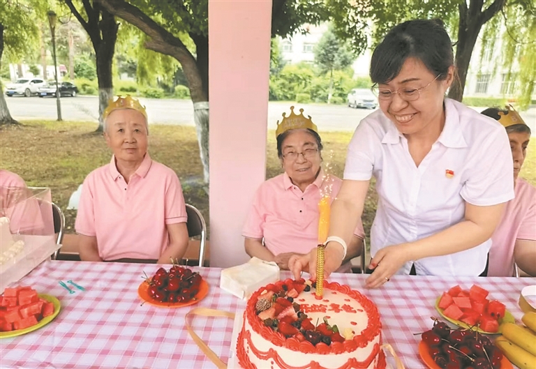 福利院工作人員為老人過生日。