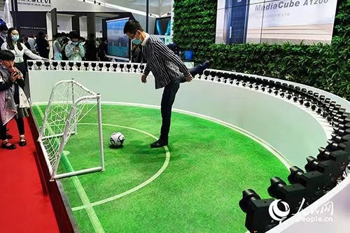市民在足球互動展區(qū)感受“超高清+自由視角”的精彩瞬間。人民網(wǎng) 劉卿攝
