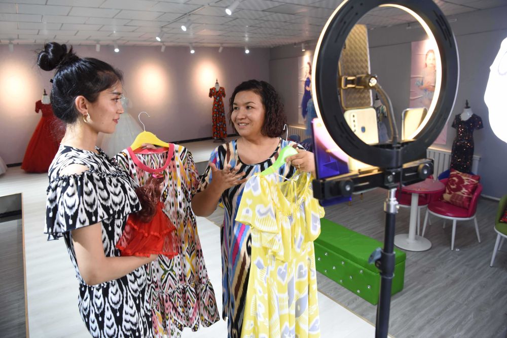 在新疆伽師縣的祖美爾服裝有限公司,公司負(fù)責(zé)人排麗旦·吐地(右)和員工討論網(wǎng)絡(luò)直播帶貨細(xì)節(jié)(7月11日攝)。2020年,排麗旦·吐地被廣東援疆指揮部遴選為致富帶頭人,獲得項(xiàng)目資金支持后,她改造展廳,增加實(shí)體店鋪,并開(kāi)展線上網(wǎng)店運(yùn)營(yíng),帶動(dòng)150人就業(yè)。新華社記者 丁磊 攝