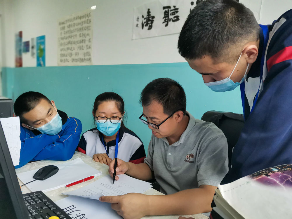 在新疆塔城地區(qū)托里縣第二中學(xué),遼寧援疆老師鄂剛(右二)幫學(xué)生分析試卷(2020年9月15日攝)。新華社發(fā)(李傳慶 攝)