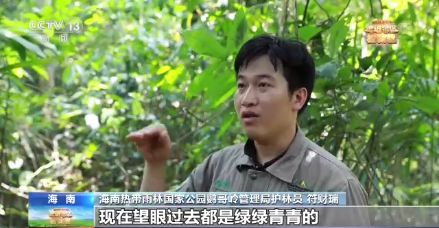 海南熱帶雨林國(guó)家公園鸚哥嶺管理局護(hù)林員 符財(cái)瑞:植被慢慢就恢復(fù)起來了,比如以前滿山都是光禿禿的,現(xiàn)在望眼過去都是綠綠青青的,就像習(xí)總書記說過,綠水青山就是金山銀山,現(xiàn)在我們看到這片林子生機(jī)盎然,給我們一種很自豪的感覺。