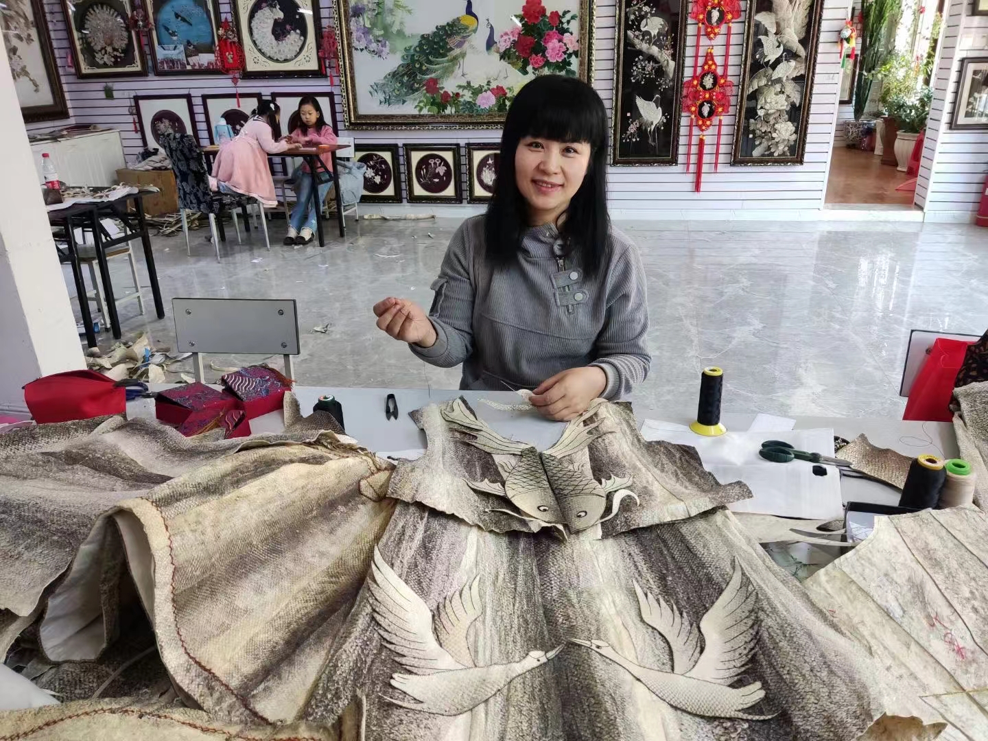 2015年,以農(nóng)民技師為主的魚皮畫農(nóng)民合作社成立,2016年,楊雙艷成立同江市巧手坊,同年楊雙艷被評為同江市非遺代表性傳承人。至此,楊雙艷的非遺之路上了新臺階,她和學(xué)員們創(chuàng)作非遺產(chǎn)品1萬余件,其中,建黨百年制作舉辦了百人百幅剪紙、13米長赫哲族婚俗系列長卷、魚皮畫作品《長城》、魚皮立體刺繡作品《大吉圖》《浩氣凌空》等作品參加了全國多項工藝美術(shù)大賽,收獲頗豐。