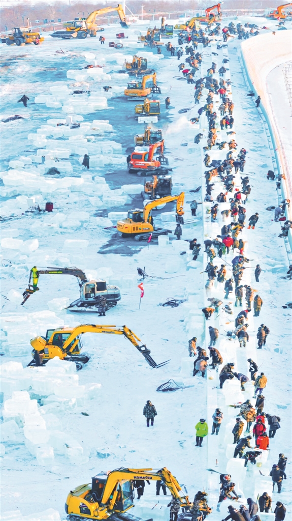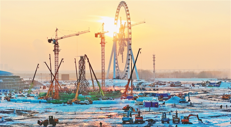 近日,哈爾濱市室外最低溫度在-20℃左右,寒氣逼人。在哈爾濱冰雪大世界園區(qū),近萬(wàn)名工人、近千輛機(jī)械緊張忙碌著。截至目前,園區(qū)主塔、超級(jí)冰滑梯、冰心筑夢(mèng)、冰河萬(wàn)象、冰雪歷程等大小景觀均在有序建設(shè)中。其中,園區(qū)主塔鋼結(jié)構(gòu)搭建已完成,進(jìn)入底部造型冰體砌筑階段,整體施工進(jìn)度完成30%。據(jù)悉,哈爾濱冰雪大世界的冰建施工期僅有半個(gè)月左右,為了搶進(jìn)度,冰建施工晝夜不停。