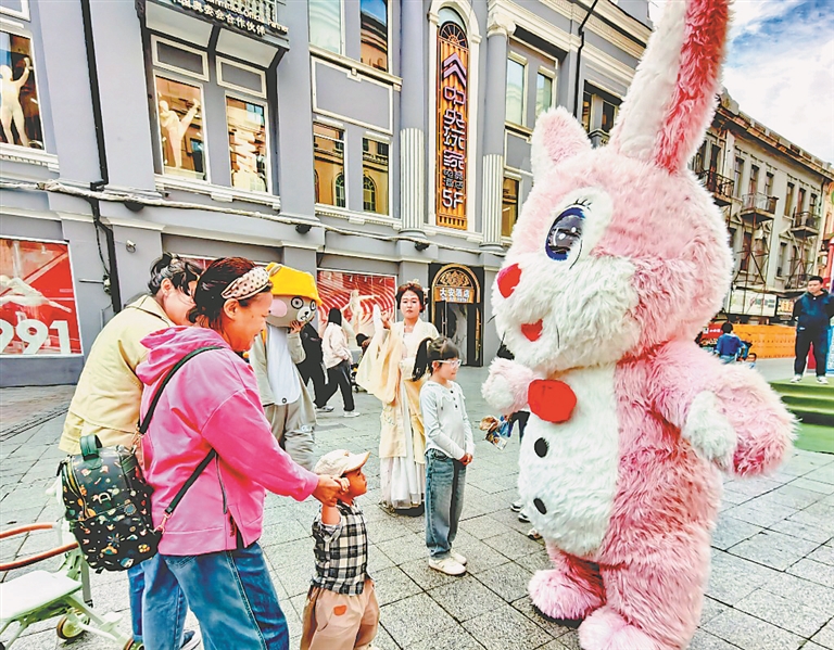 街道兩側的樹木盡顯秋色,與百年建筑相互映襯,如同一幅美麗的油畫。人們紛紛用手機記錄下精彩瞬間。美食攤位前,烤肉串、烤紅腸、烤魷魚、鍋包肉等散發(fā)出的香味令人垂涎欲滴;冰棍、格瓦斯、大面包等本地特色食品吸引游客排隊購買;熊貓、老虎、兔子等卡通人偶站在路旁,與游人互動、合影。