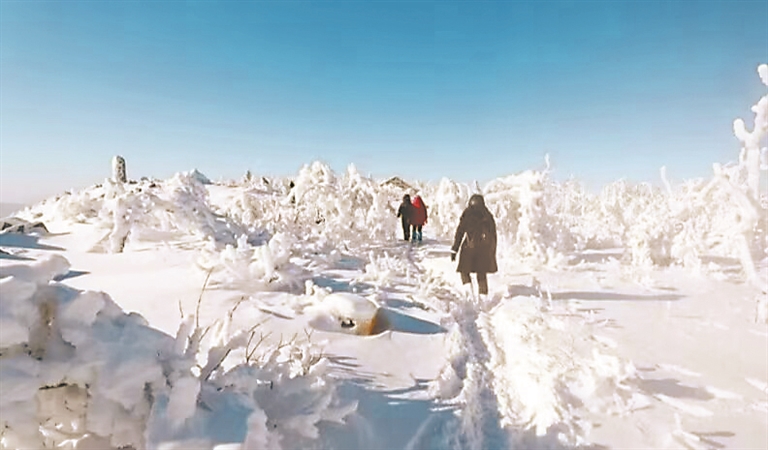 “那知忽作三尺雪,草木洗盡群芳空?!毖┖蟮乃煞迳揭簧磴y裝素裹,在山里行走,仿佛置身潔凈的水晶宮中,滿山遍野的樹枝在朝陽下白凌閃爍。蜿蜒曲折的山間棧道上,皚皚白雪舞長龍,微風一吹蘆花飛。起初體力充沛,腳踩在雪上嘎吱嘎吱聲變成踏雪前行的輕歌小曲,心逐漸隨著勻稱的步伐變得安靜飄逸,腳下一步緊接一步地向前邁進,灑滿腳印的路在我們身后越拉越長。