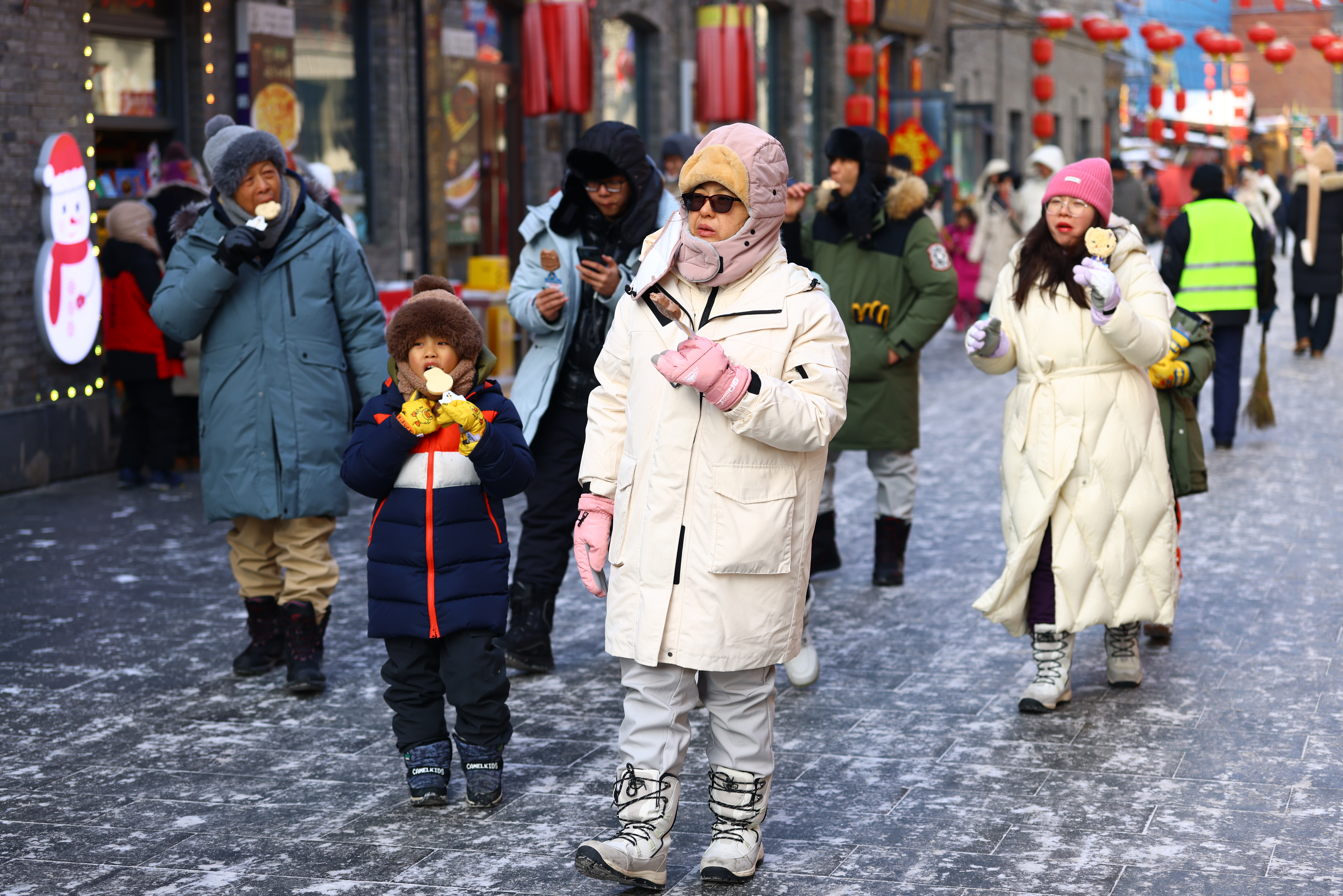 街區(qū)里,巴洛克建筑風格與中式傳統(tǒng)元素交融,紅墻綠瓦、雕花窗欞,在皚皚白雪映襯下別具韻味,吸引游客紛紛駐足拍照。街邊店鋪熱鬧開張,糖葫蘆、馬迭爾冰棍等特色美食攤位前游客排起長龍,一邊品嘗,一邊感受冰城獨特的年味。不少游客走進民俗手工藝品店,選購剪紙、冰燈模型等紀念品,將哈爾濱的新春記憶打包帶走。