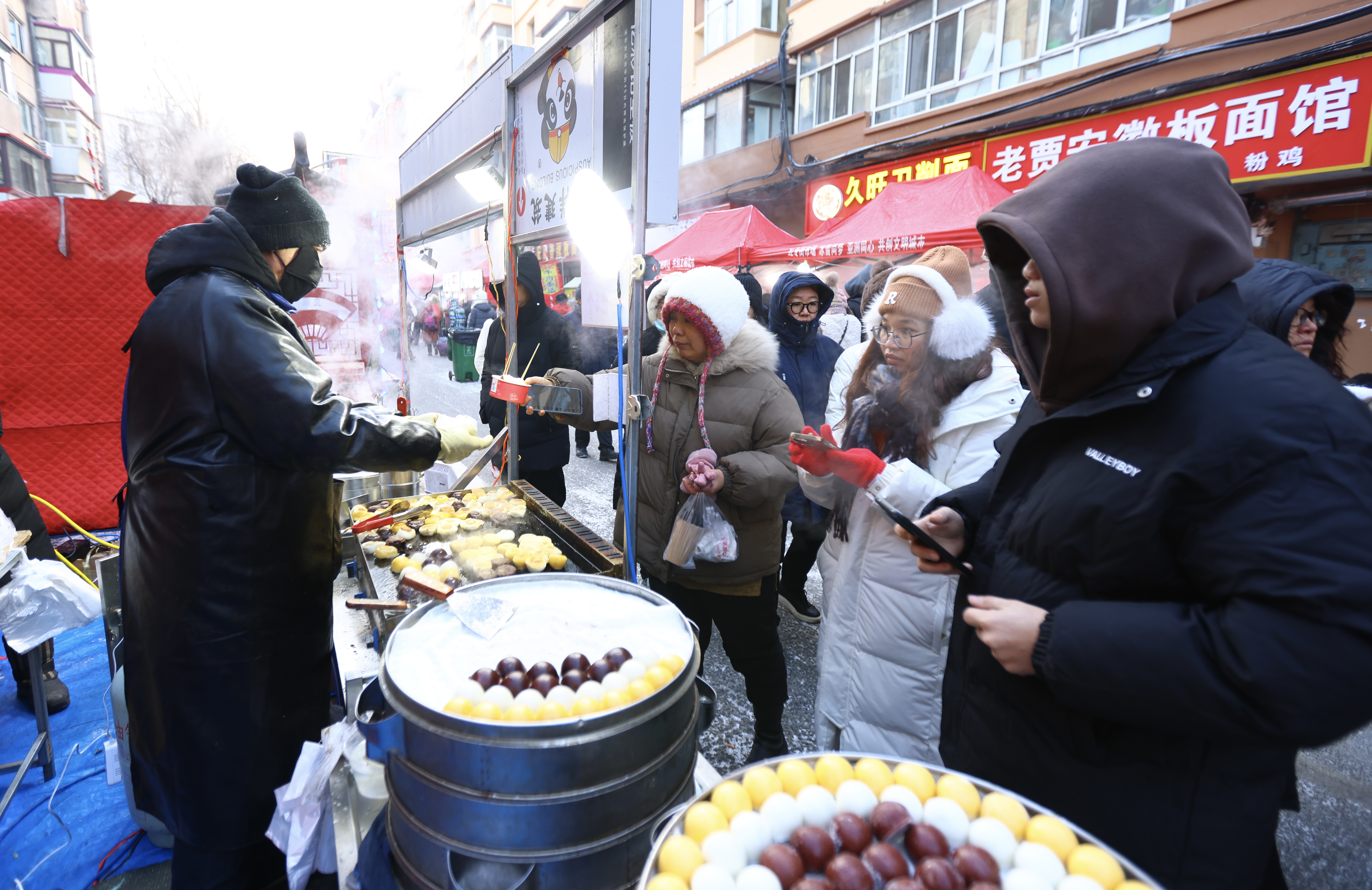 早上六點,紅專街早市已經(jīng)熱鬧非凡。盡管戶外氣溫達到零下25攝氏度,早市上卻是一片火熱景象。街道兩旁張燈結(jié)彩,大紅燈籠高高掛起,處處洋溢著喜慶的節(jié)日氛圍。