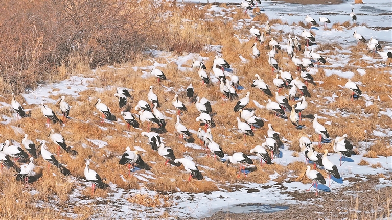 近日,百余只素有“鳥中大熊貓”美譽的東方白鸛集群飛抵寶清縣東升省級自然保護區(qū)。它們有的在淺水中悠然散步,有的在岸邊梳理羽毛,有的在水面上戲水覓食,有的在空中自由漫舞,一派悠然自在的景象。