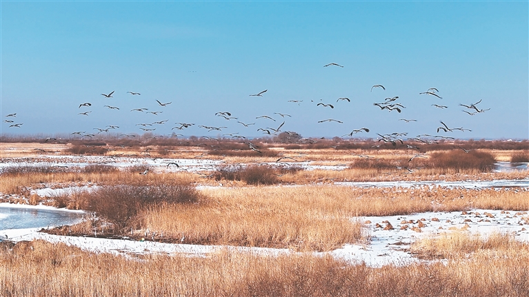鳥類是地方環(huán)境的“生態(tài)試紙”。東升濕地豐富的食物和適宜的棲息環(huán)境,吸引東方白鸛、丹頂鶴、白枕鶴、蒼鷺、大雁等野生鳥類成群結(jié)隊在此地落腳。候鳥種群數(shù)量逐年增長,已記錄到的鳥類多達185種,其中國家重點保護鳥類就達30種,丹頂鶴、白枕鶴、東方白鸛、白尾海雕等國家一級保護鳥類5種,大天鵝、白琵鷺、鴛鴦等國家二級保護鳥類25種。