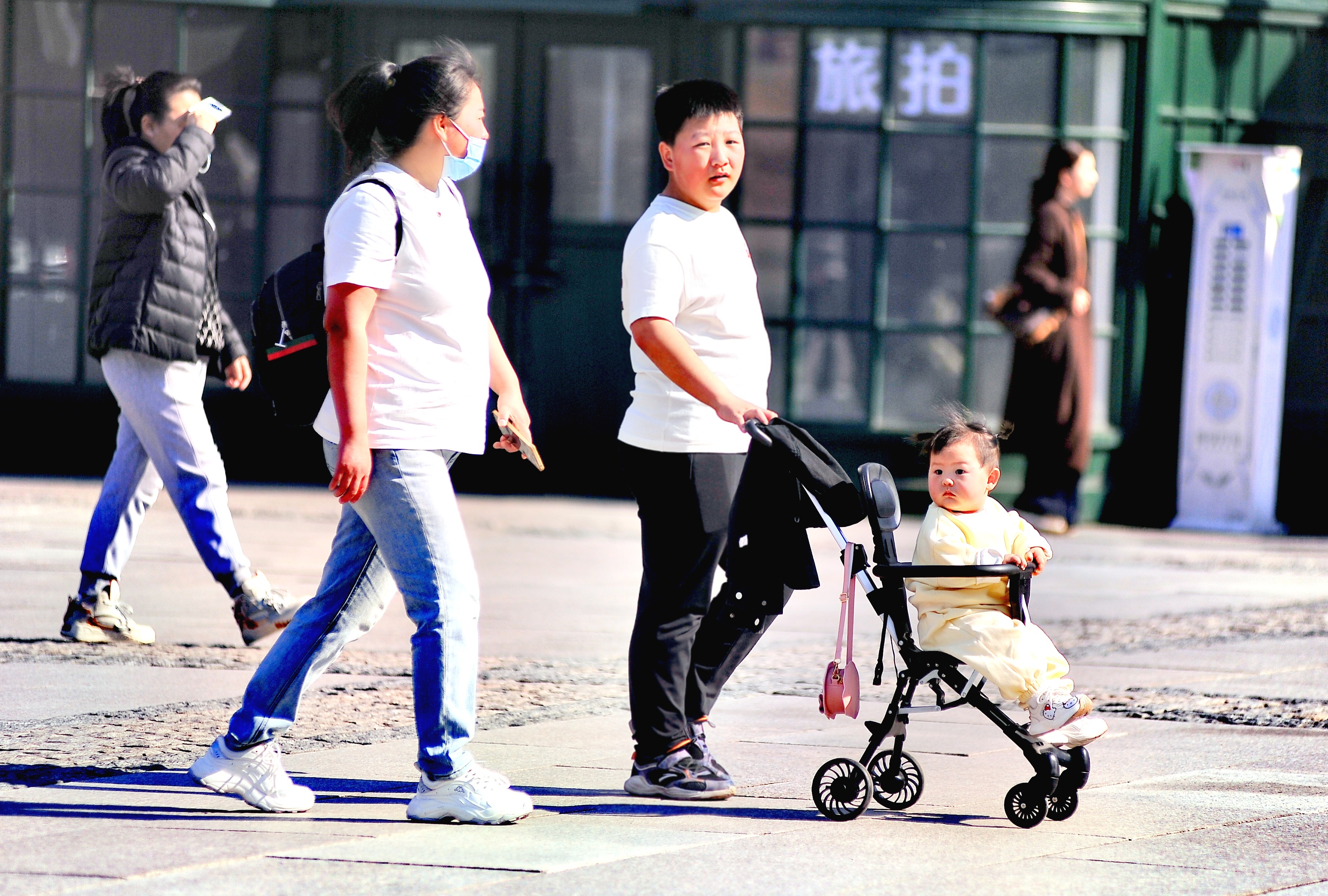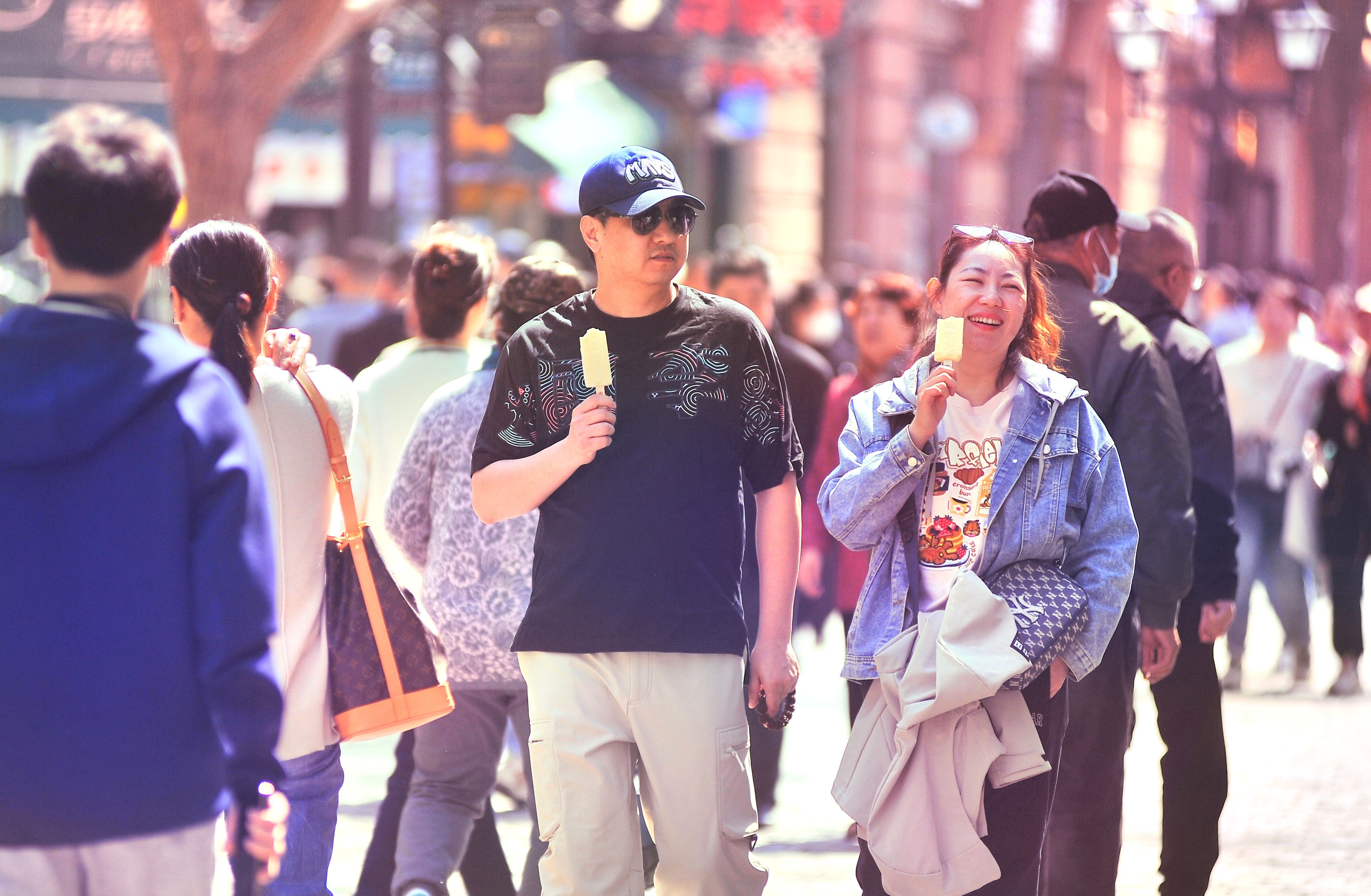 9日,哈爾濱市最高氣溫達(dá)20℃,在街頭、廣場(chǎng)等地,許多市民和游客穿短袖T恤、短裙、襯衫等出行。