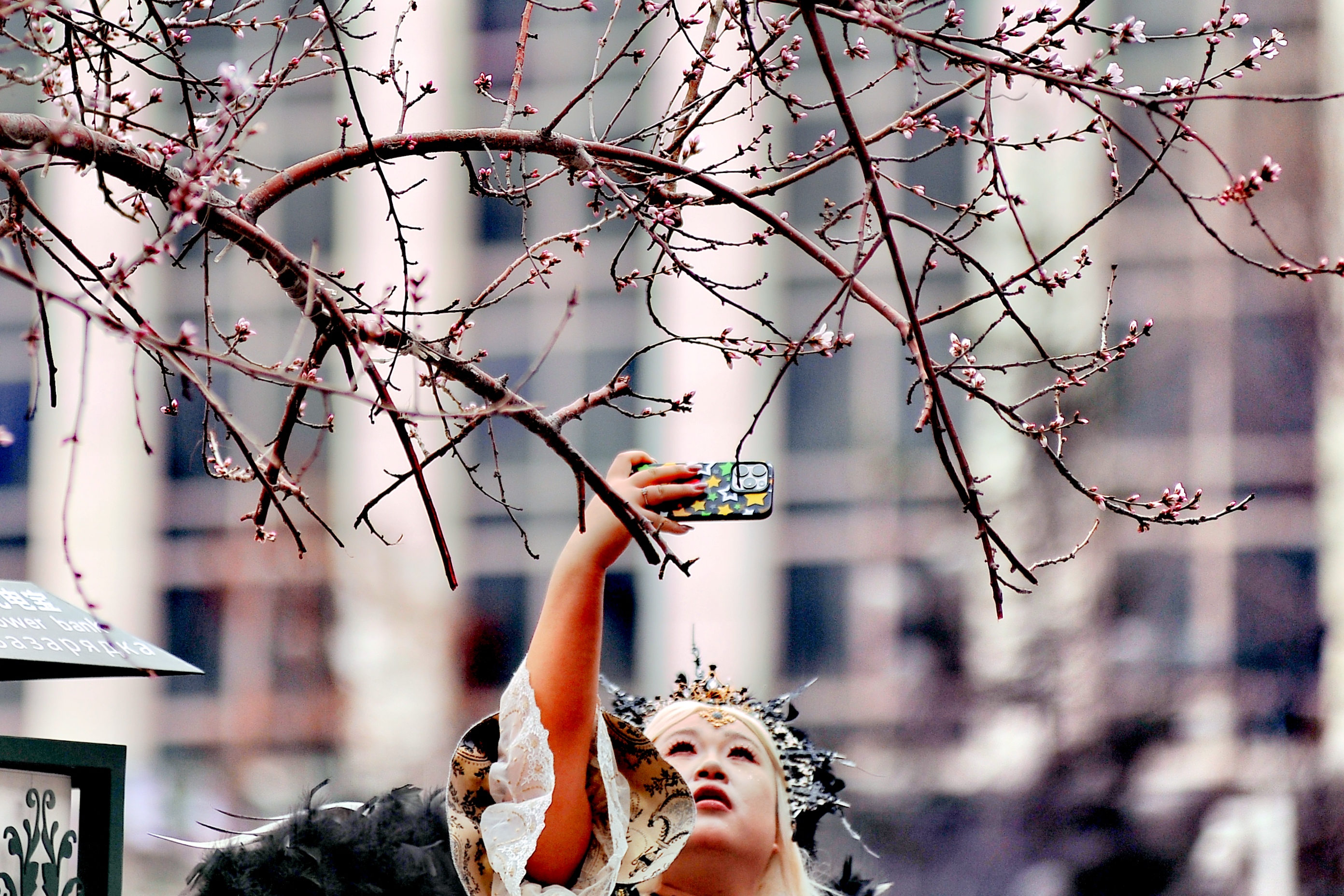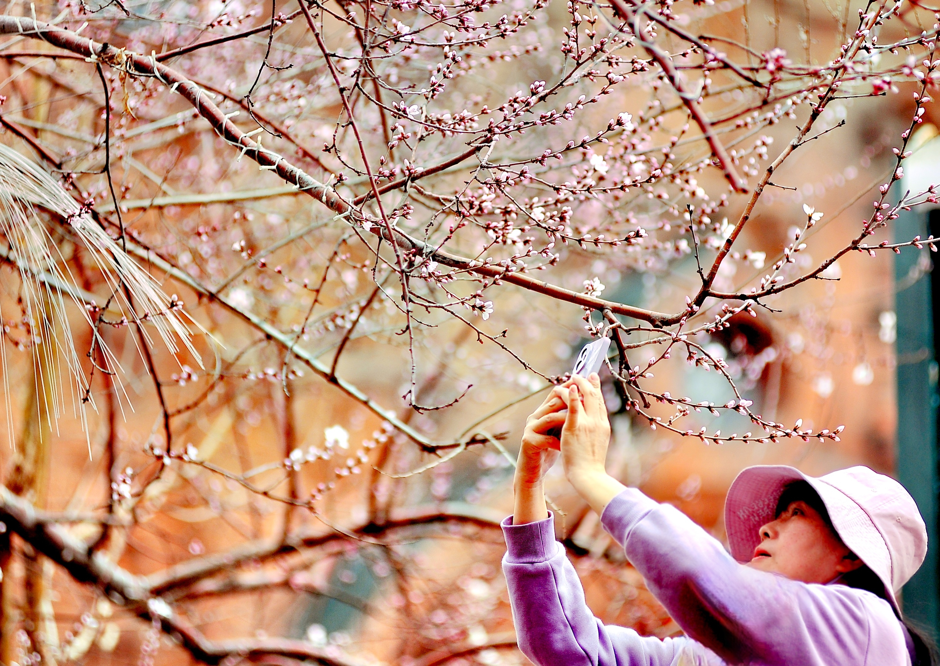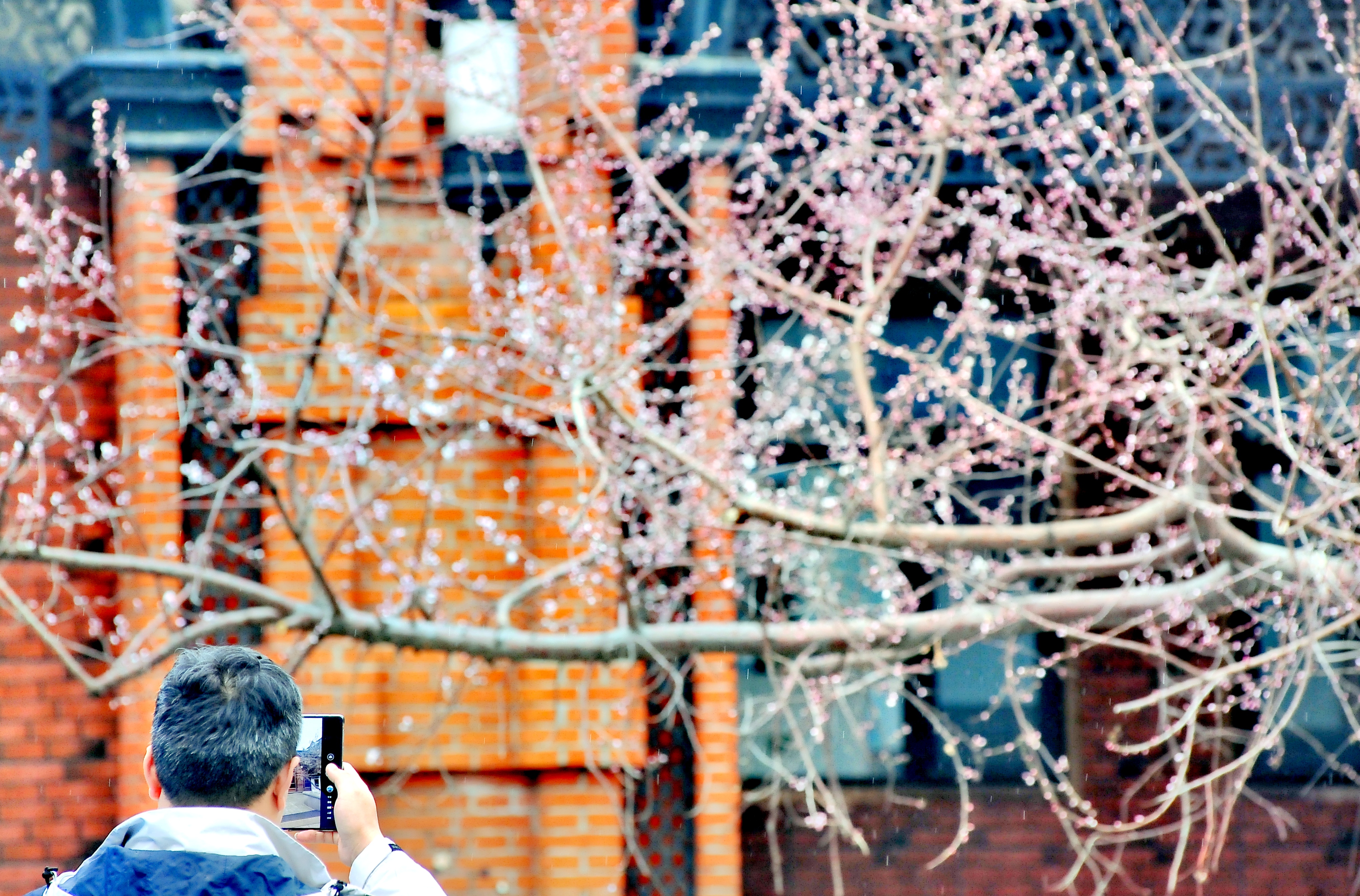 哈爾濱市建筑藝術(shù)廣場綠地旁,一些游客正在觀賞、拍攝綻放的山桃花;枝頭上密布著粉色的花朵和含苞欲放的花蕾,將廣場裝點得非常美麗。
