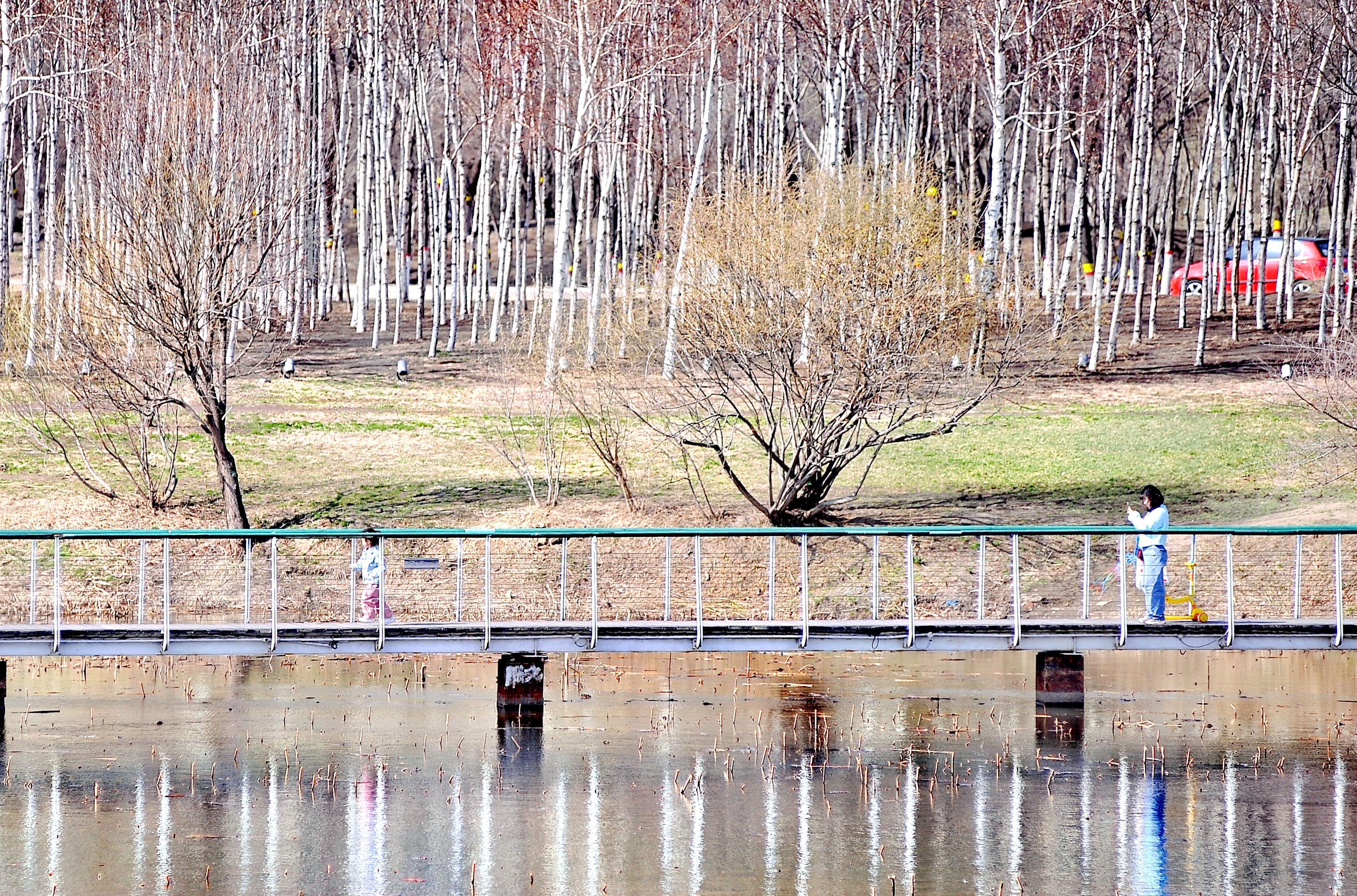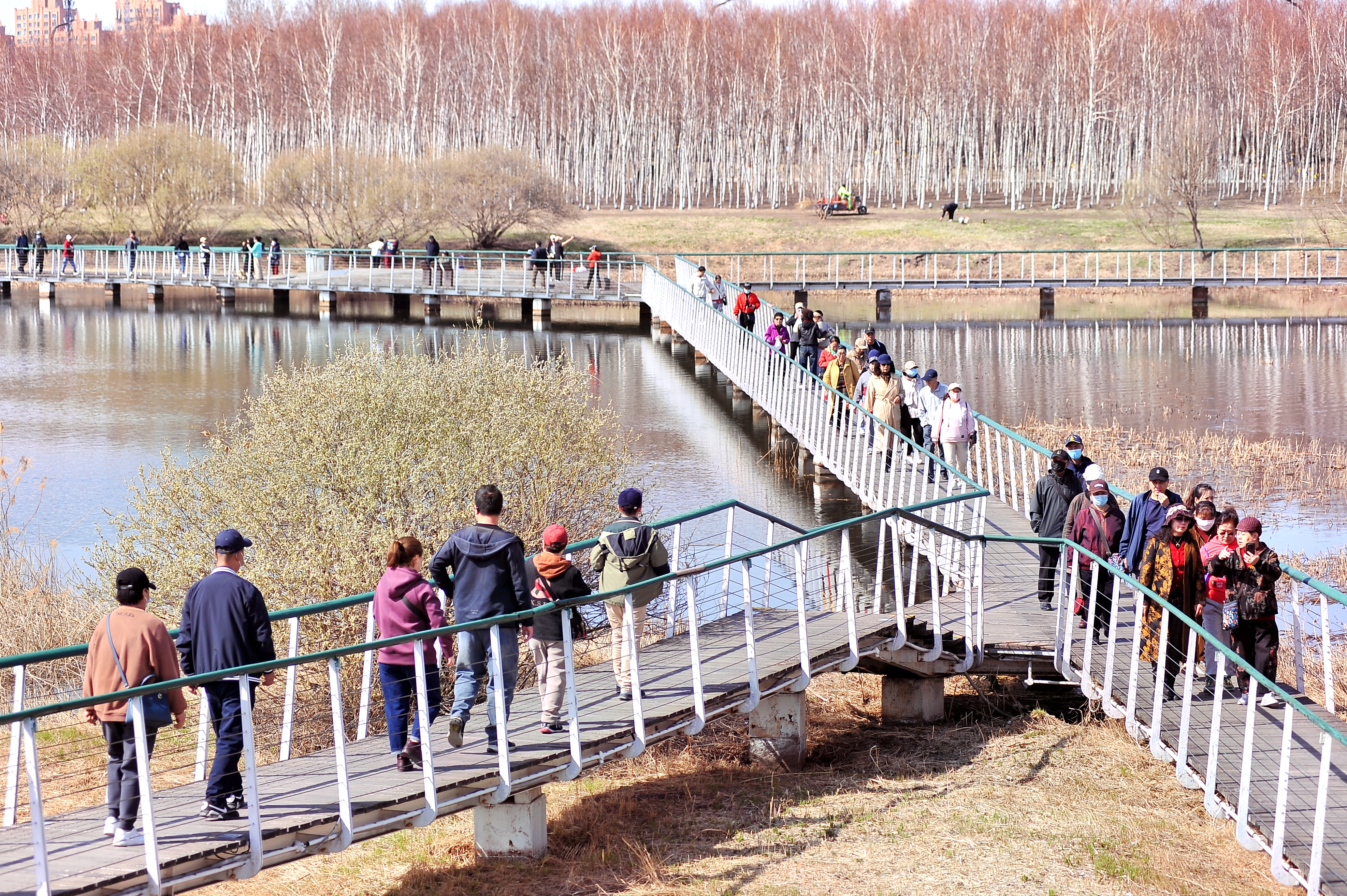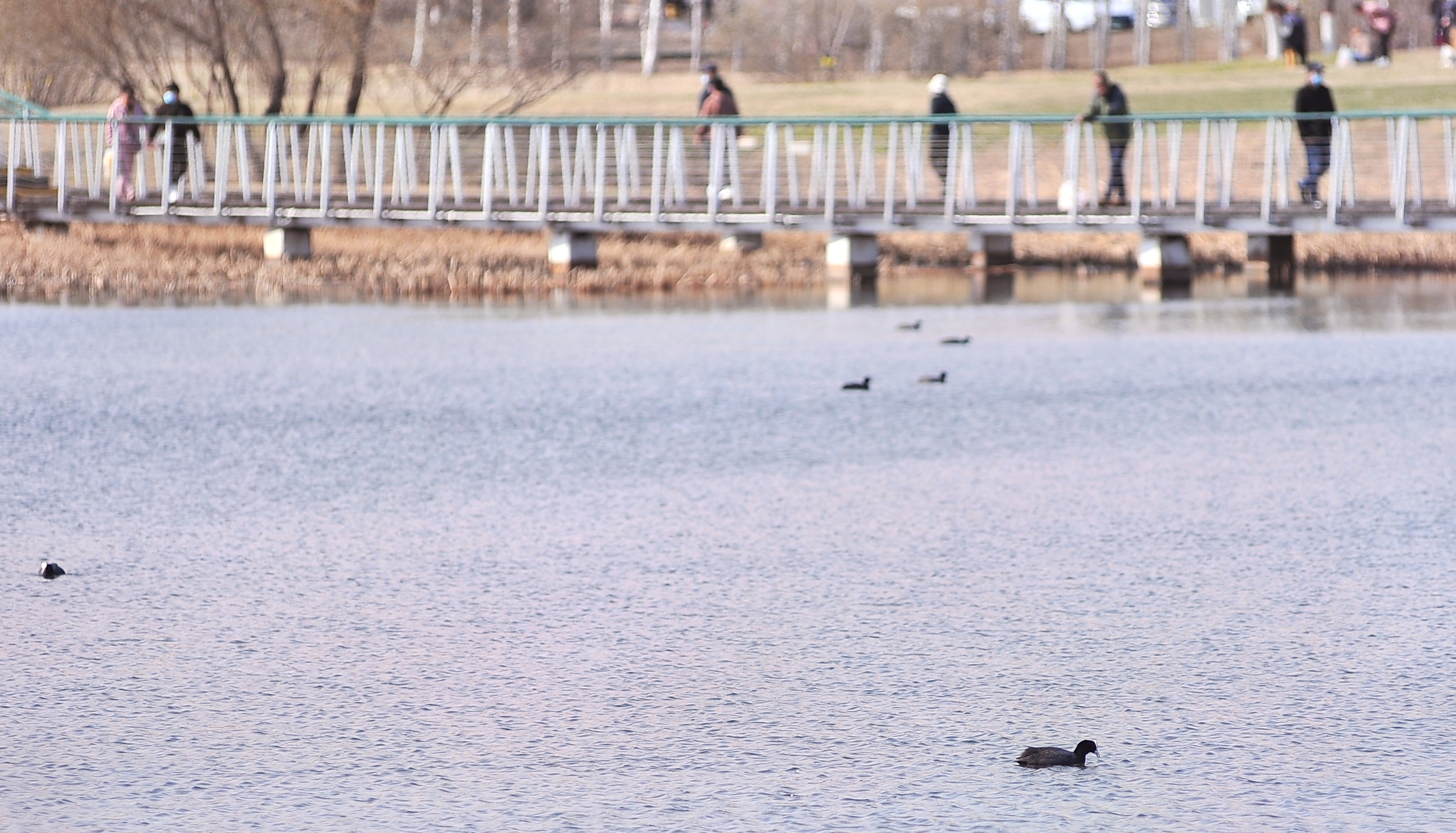 16日,哈爾濱大劇院附近的文化中心濕地公園內(nèi),數(shù)十只白骨頂雞、野鴨子在水面上游弋、覓食,空中不時(shí)有鷗鳥(niǎo)飛過(guò),游客和市民走上蜿蜒曲折的觀(guān)光棧橋,與這些鳥(niǎo)來(lái)個(gè)“親密接觸”;岸邊種植的白樺樹(shù),倒映在水中,景色美如油畫(huà),游客和市民紛紛拿出手機(jī)、相機(jī),記錄下美麗的瞬間。
