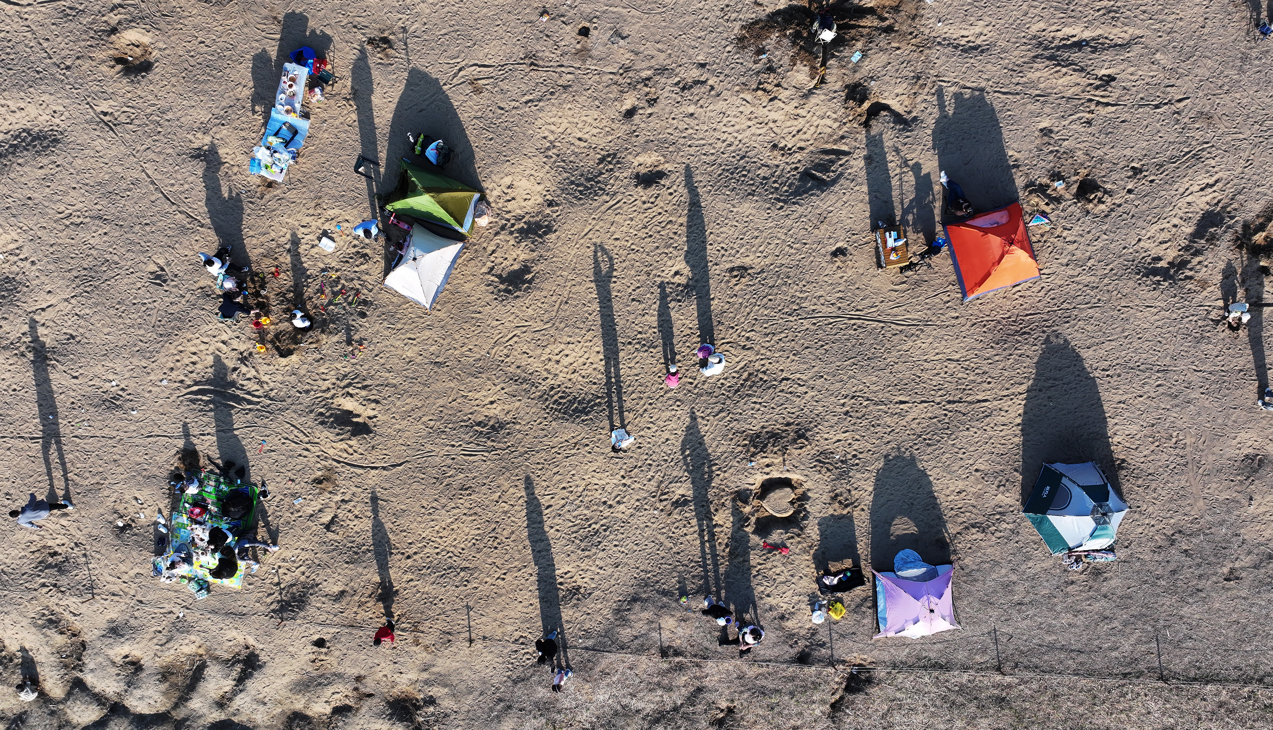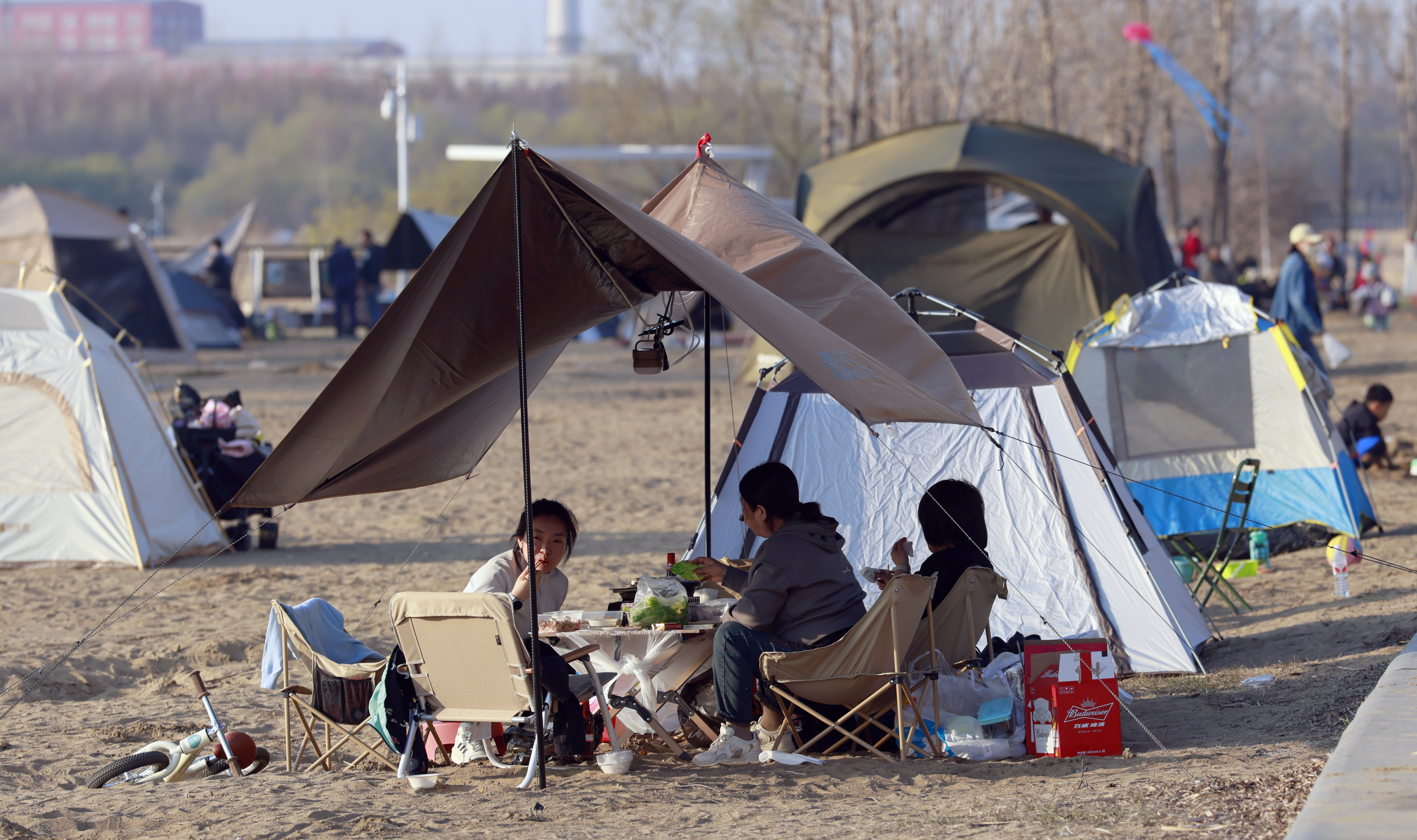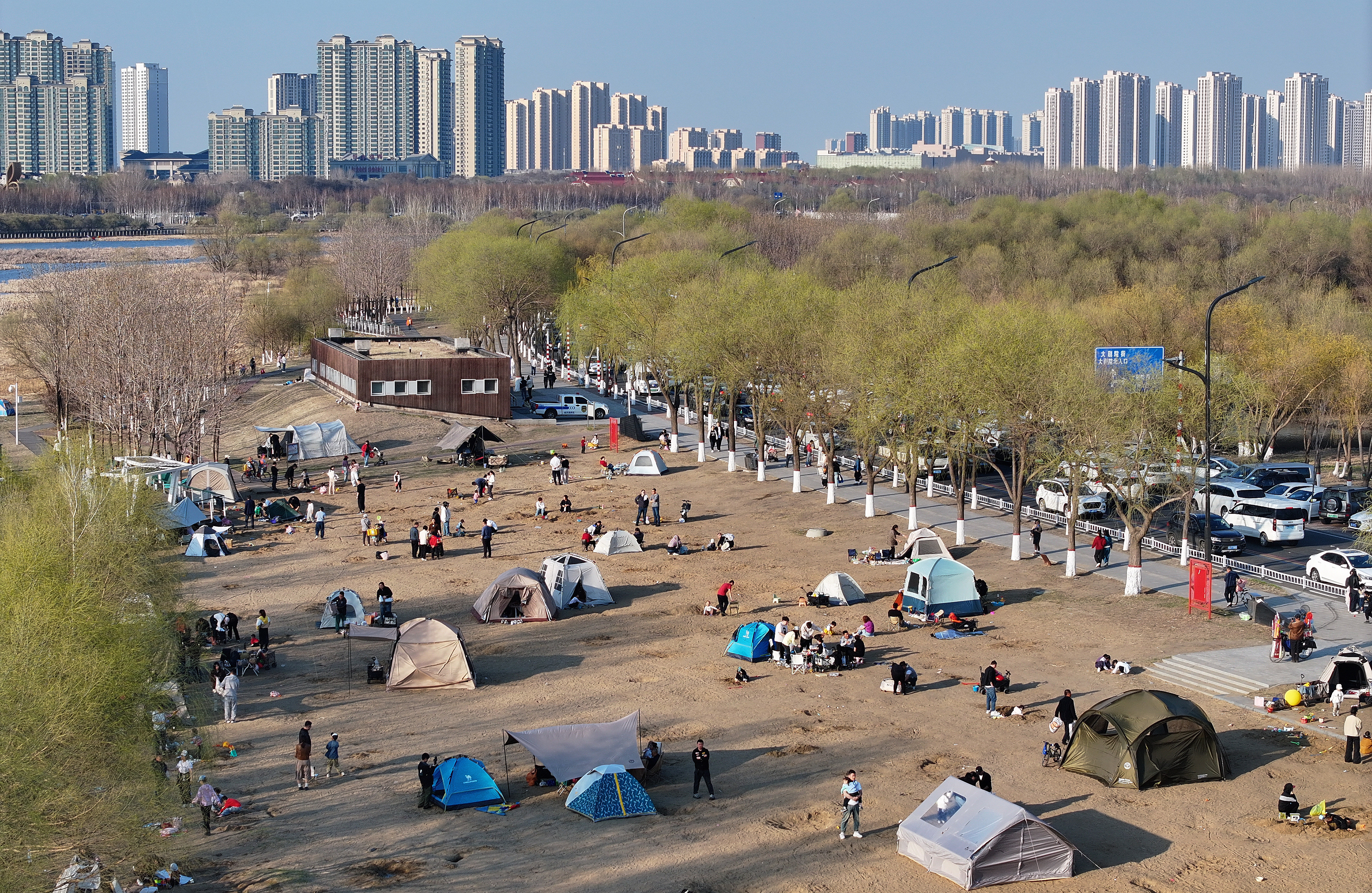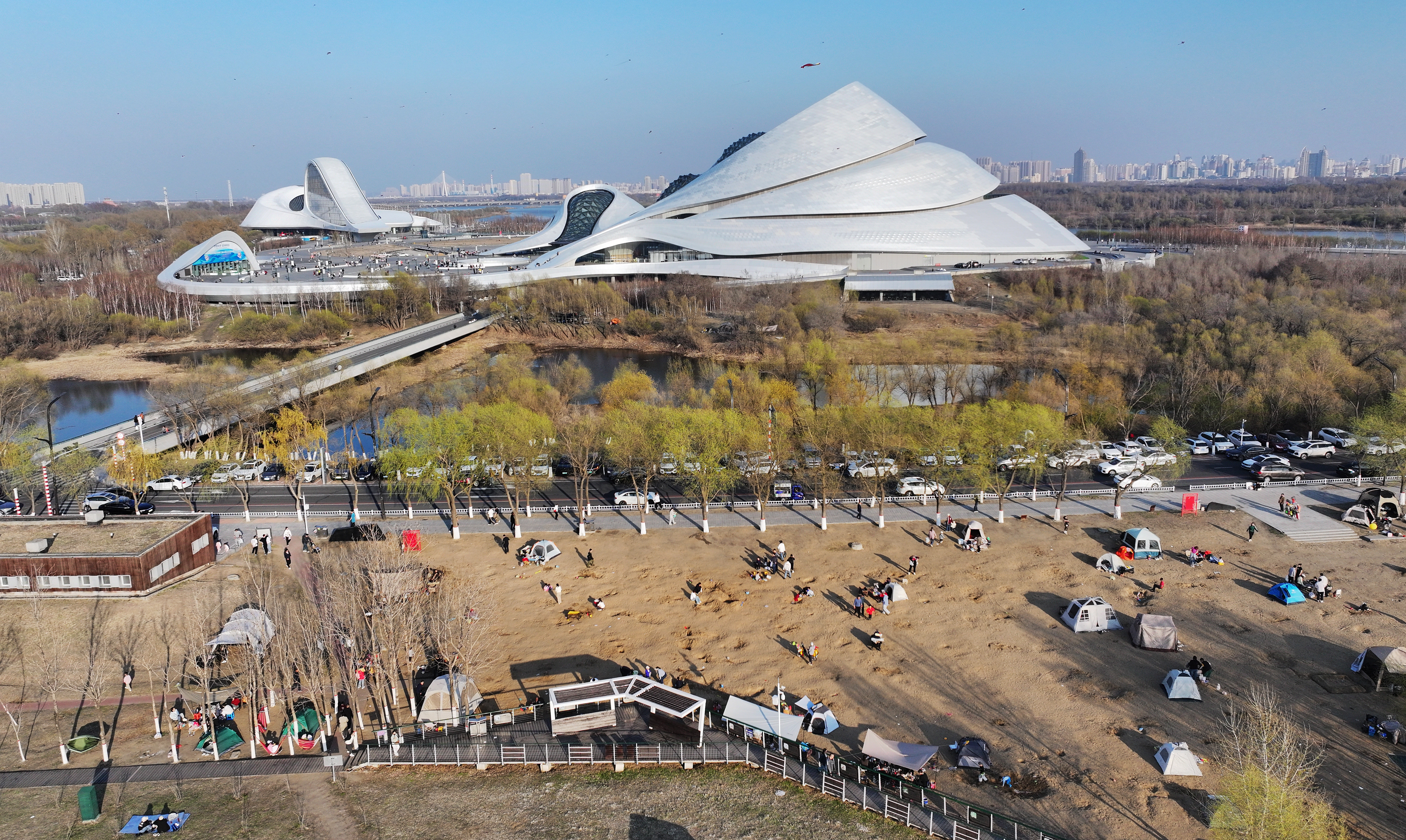近日,哈爾濱市春光明媚,哈爾濱大劇院濕地有大批市民在此露營,享受春光。沙灘上,樹蔭下,孩子們盡情嬉戲玩耍,大人們在一旁野餐打牌,愜意度過美好的春日時光。
