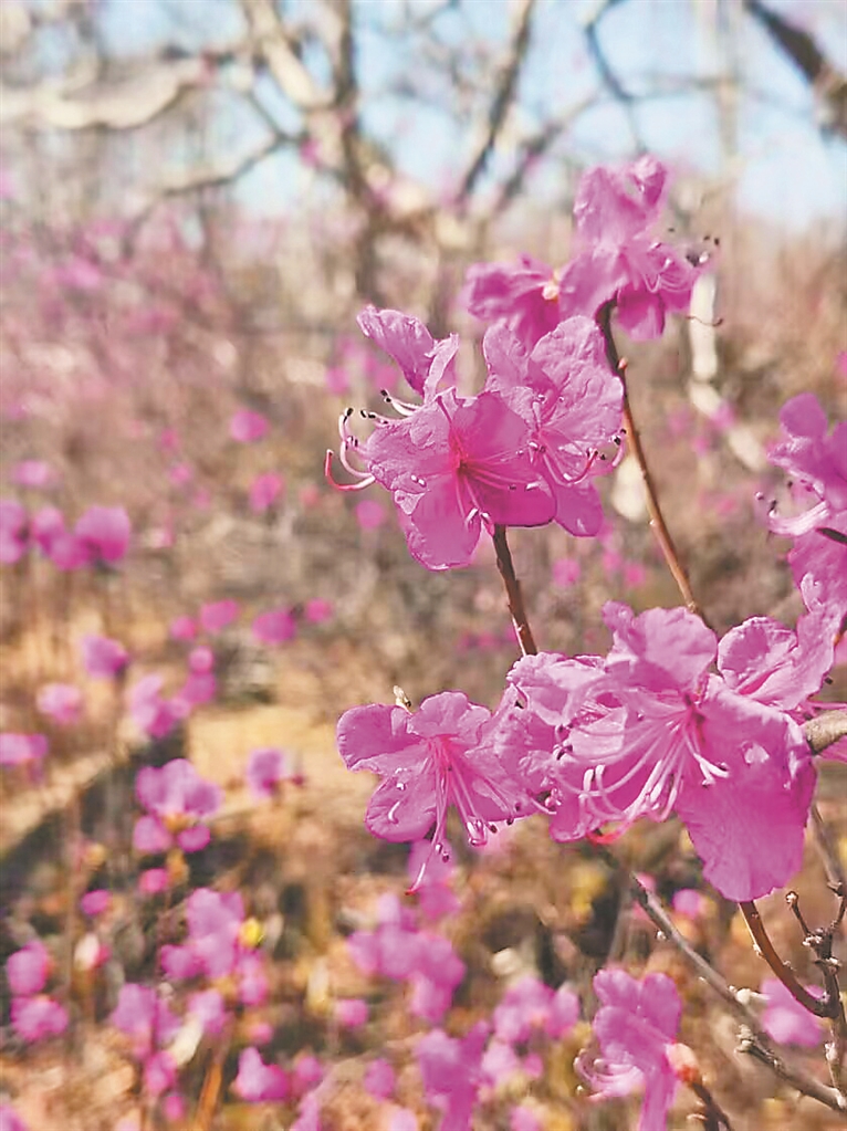 山坡上,藍(lán)天下,白樺嫩葉初吐,杜鵑紅艷渴人。當(dāng)大家進(jìn)入林間的團(tuán)團(tuán)簇簇花叢,立刻被起伏的花浪淹沒(méi),只露出頭肩。我們似在花海中游泳,滿(mǎn)眼是粉紅波浪,浪花芬芳襲人、盡染衣袂。其間起伏忙碌的蜜蜂、翩翩起舞的蝴蝶,像海面的魚(yú)和飛鳥(niǎo)躍動(dòng)在我們眼前腦后……