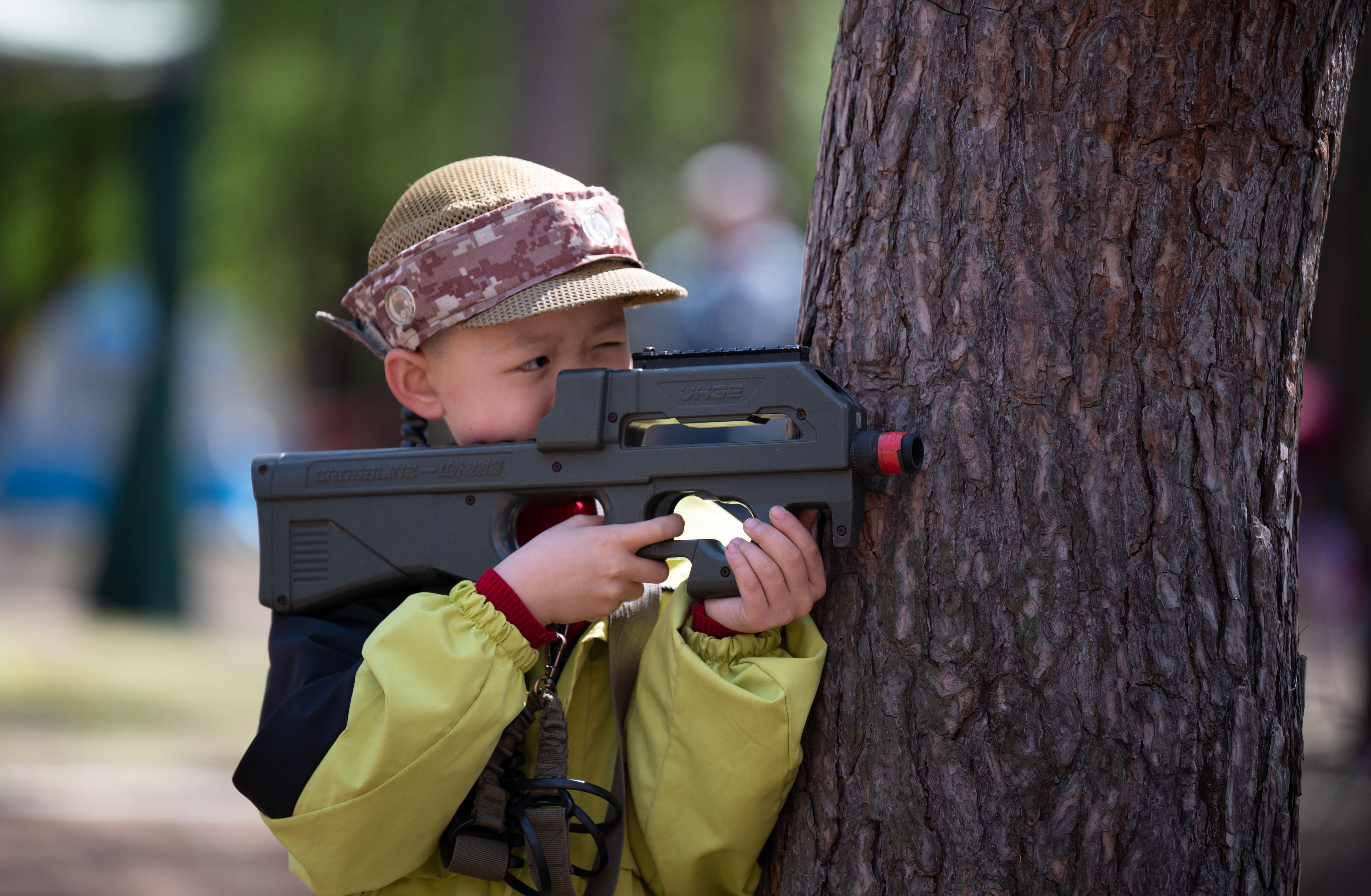 孩子們有的騎上自行車(chē),在甬道上穿行,有的幾人一組,玩起了真人CS。