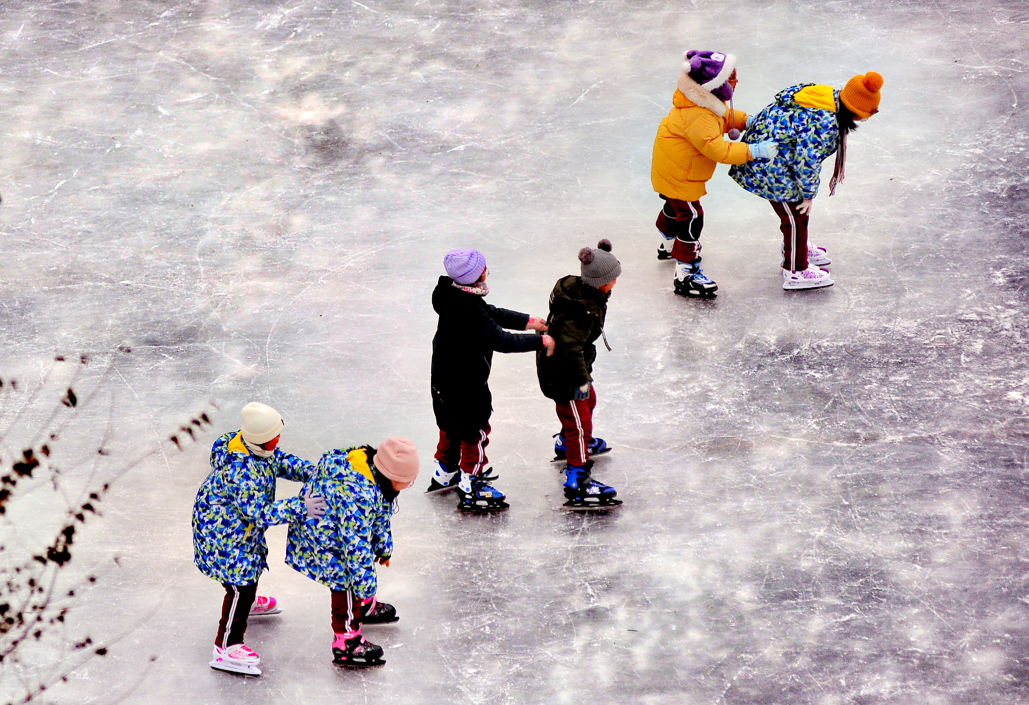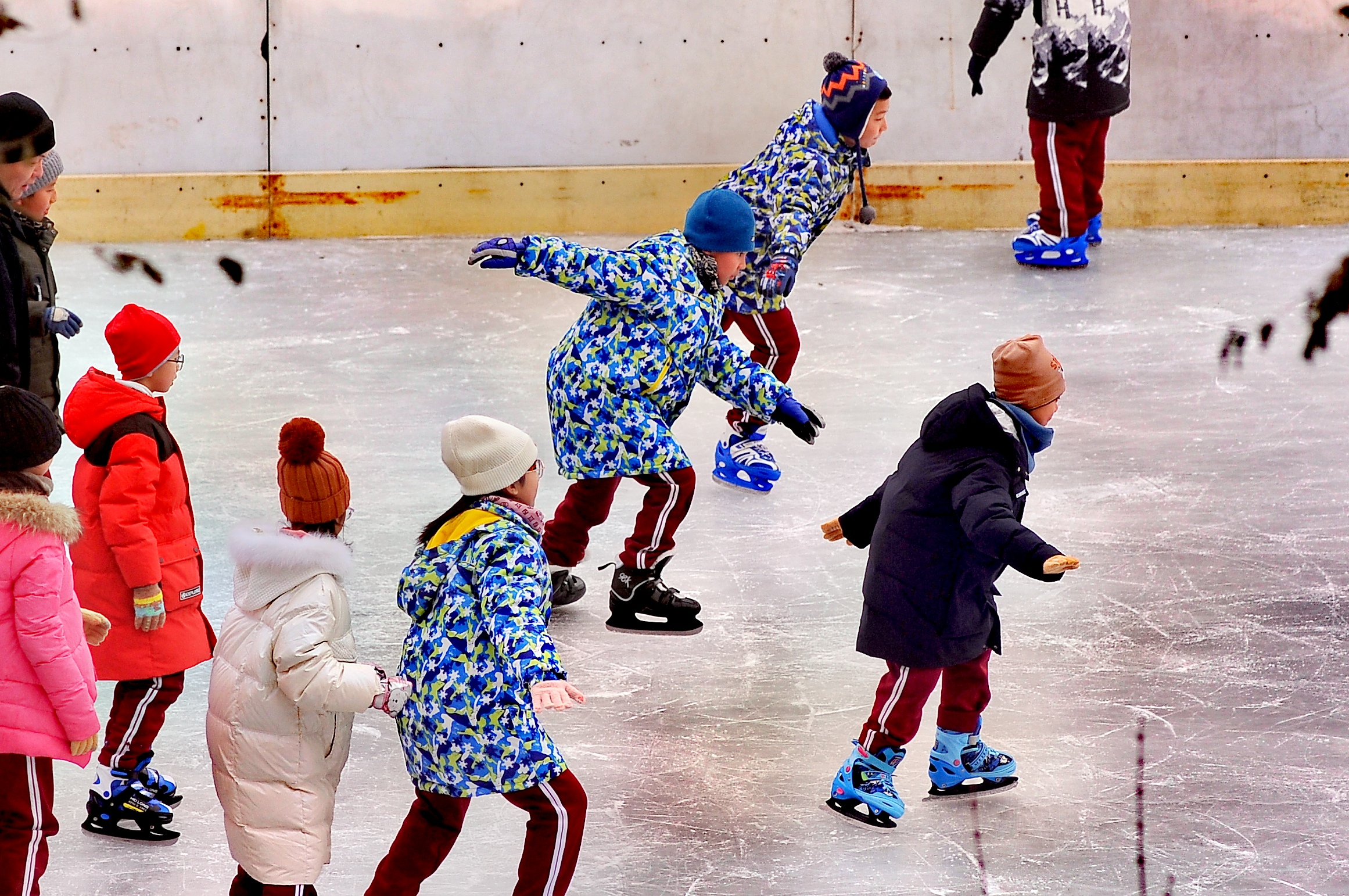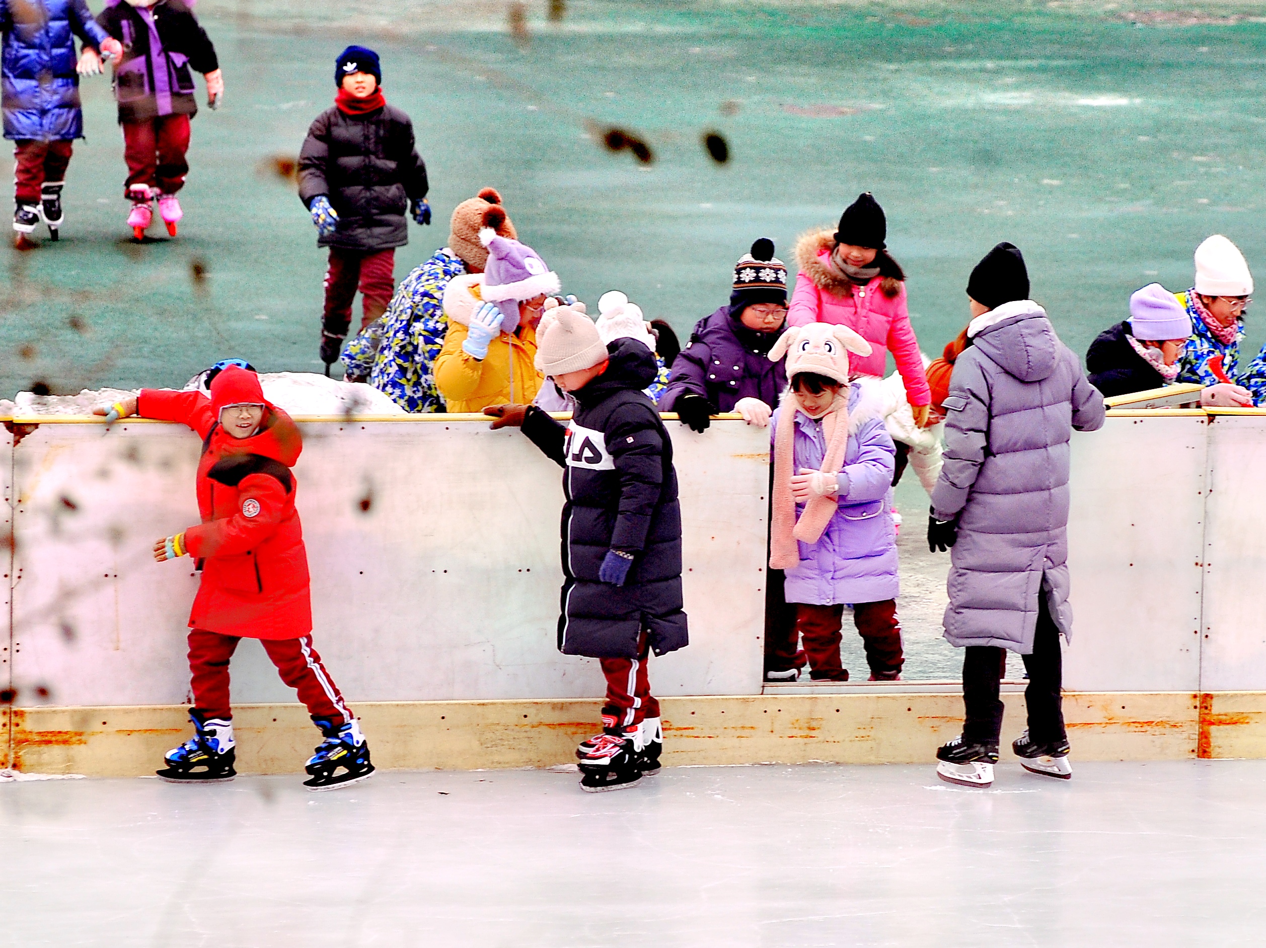 這些學(xué)生中有的是新手,需把著護(hù)欄前行,生怕摔倒;有的已是冰場“老將”,在冰面上隨意加速、剎車。