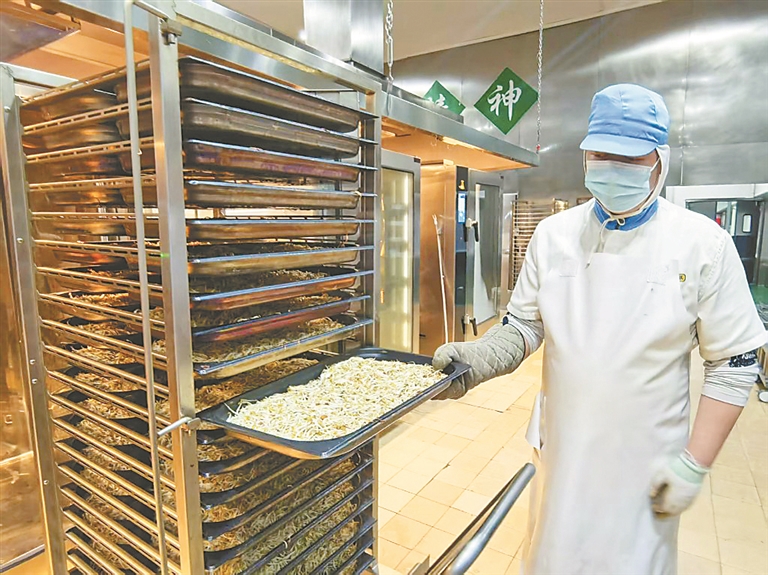 在烹制間,企業(yè)新購置的9臺(tái)萬能蒸烤箱設(shè)備和兩條無油蒸烤加工線正高速運(yùn)轉(zhuǎn)。這些新設(shè)備采用蒸烤一體原理,加工過程中可保證蔬菜水分和營養(yǎng)不流失,實(shí)現(xiàn)無油炸制品。該負(fù)責(zé)人稱,萬能蒸烤箱采取輕烹工藝,達(dá)到少鹽、少油、少糖的效果,可以讓食材在制作過程中保鮮,師生吃起來更加營養(yǎng)健康。
