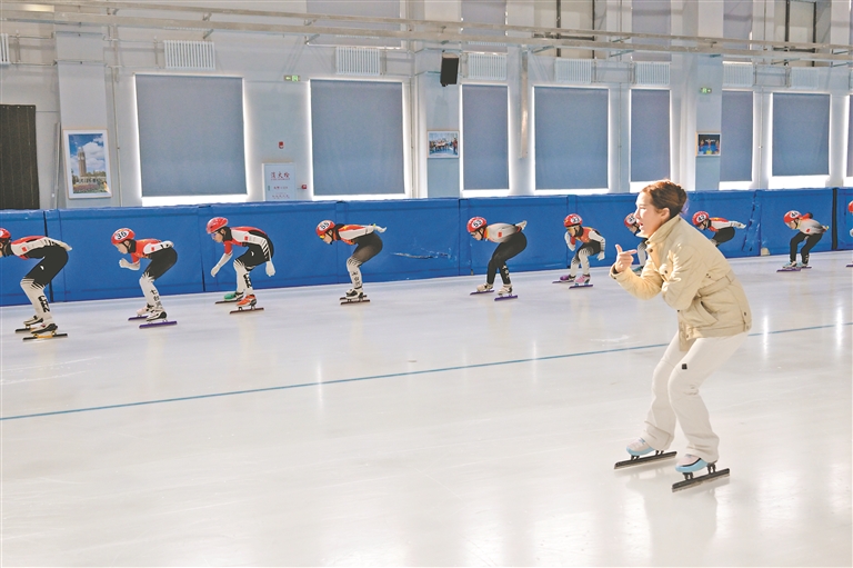 張杰在指導(dǎo)隊員們做冰上訓(xùn)練。