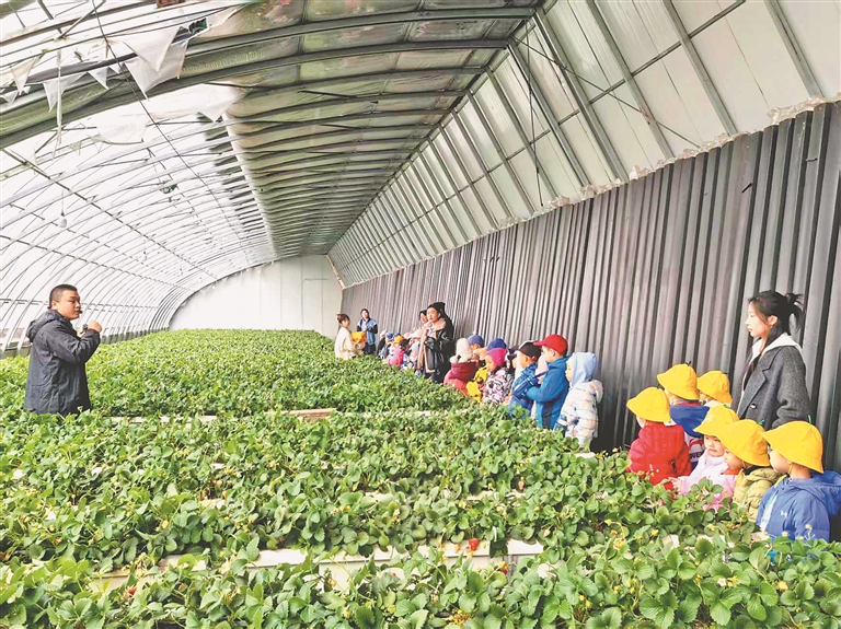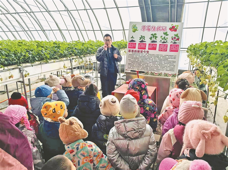 “小朋友們,你們知道草莓的生長周期是多久嗎?”棚室內(nèi),小朋友們帶著探索奧秘的神情,一邊認(rèn)真聆聽工作人員講解,一邊提出各種有趣的問題,現(xiàn)場互動氛圍熱烈,孩子們在沉浸式的農(nóng)業(yè)科普課堂中,近距離地感受著設(shè)施農(nóng)業(yè)生產(chǎn)的魅力;從田間到舌尖,親手采摘的草莓,帶著春日暖陽與泥土的芬芳,孩子們自己動手制作草莓冰糖葫蘆。