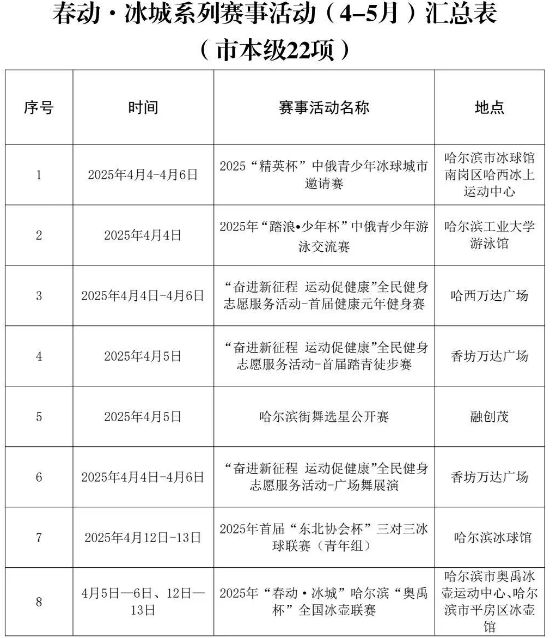 為充分發(fā)揮“亞冬效應(yīng)”,延續(xù)亞冬會(huì)帶來(lái)的體育熱度,哈爾濱市啟動(dòng)“春動(dòng)·冰城”系列賽事活動(dòng)。在4至5月的春季時(shí)段,哈爾濱市將組織48項(xiàng)體育賽事活動(dòng),全力推動(dòng)體育事業(yè)發(fā)展,提升城市體育影響力。這是記者從哈爾濱市體育局9日召開(kāi)的2025年“春動(dòng)·冰城”賽事活動(dòng)新聞通氣會(huì)暨體育聯(lián)合項(xiàng)目簽約儀式上獲悉的。
