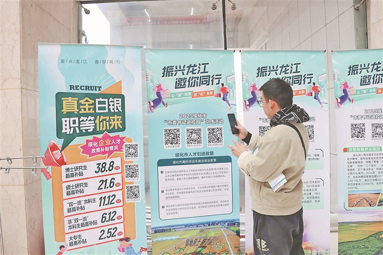 在東北農業(yè)大學校園招聘會現(xiàn)場,一條印有“‘市委書記進校園’引才活動綏化專區(qū),心‘綏’所愿、共‘化’未來”的條幅格外醒目。綏化市依托綏化就業(yè)大集這一平臺展開同步直播,線上線下聯(lián)動,4場招聘會總瀏覽量達12萬次。