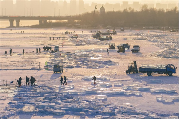 哈爾濱冰雪大世界采冰工作現(xiàn)場(chǎng)。