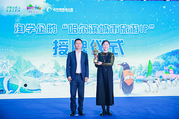 儀式現(xiàn)場,黑龍江省文化和旅游廳黨組書記、廳長何晶為“淘學企鵝”頒發(fā)“黑龍江冰雪天使”獎牌;哈爾濱市文化廣電和旅游局黨組書記、局長王洪新為“淘學企鵝”頒發(fā)“哈爾濱城市旅游IP”獎杯。