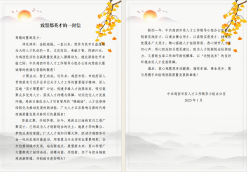 春節(jié)將至,歲寒情暖。雞西市深入落實黨委聯(lián)系服務(wù)專家制度,密切包聯(lián)服務(wù)高層次人才,廣泛開展走訪慰問、包聯(lián)服務(wù)活動,全力營造尊才愛才的濃厚氛圍。